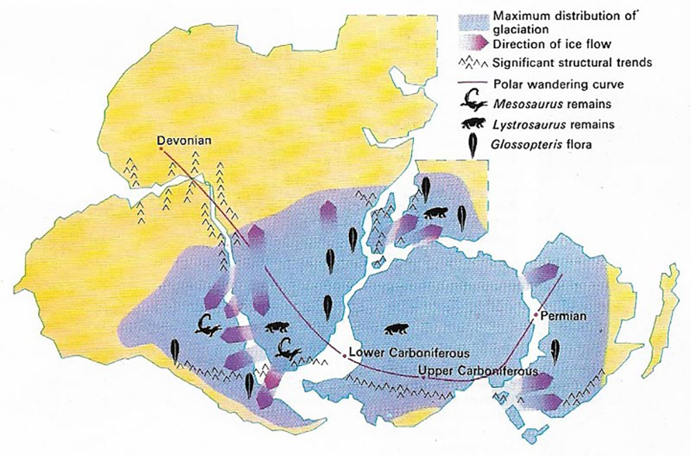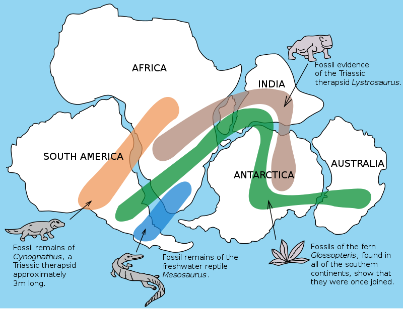 භූ තැටි සහ මහද්වීප චලනය පිළිබඳ සාක්ෂි දැන් ඉතාමත් පුළුල් වී තිබේ. මහද්වීපවල වෙරළ ආශ්රිතව සමාන ශාක සහ සත්ව ෆොසිල දක්නට ලැබෙන අතර ඒවා වසර මිලියන ගණනකට පෙර එකට එක්ව තිබූ දැවැන්ත ගොඩබිම් බවට මෙය හොඳ සාක්ෂියකි. කුඩා කිඹුලකු වැනි මිරිදිය උරගයකු වන මෙසෝසෝරස්ගේ ෆොසිල මේ සඳහා එක් හොඳම උදාහරණයකි. අප්රිකාවේ, ඉන්දියාවේ සහ ඇන්ටාක්ටිකාවේ ප්රදේශවලින් එකම වයසේ පාෂාණවලින් ගොඩබිම උරගයකුවන ලිස්ට්රොසෝරස්ගේ ෆොසිල සොයාගැනීමටත් හැකිවූයේ මේ සිද්ධාන්තය සනාථ කරමිනි.