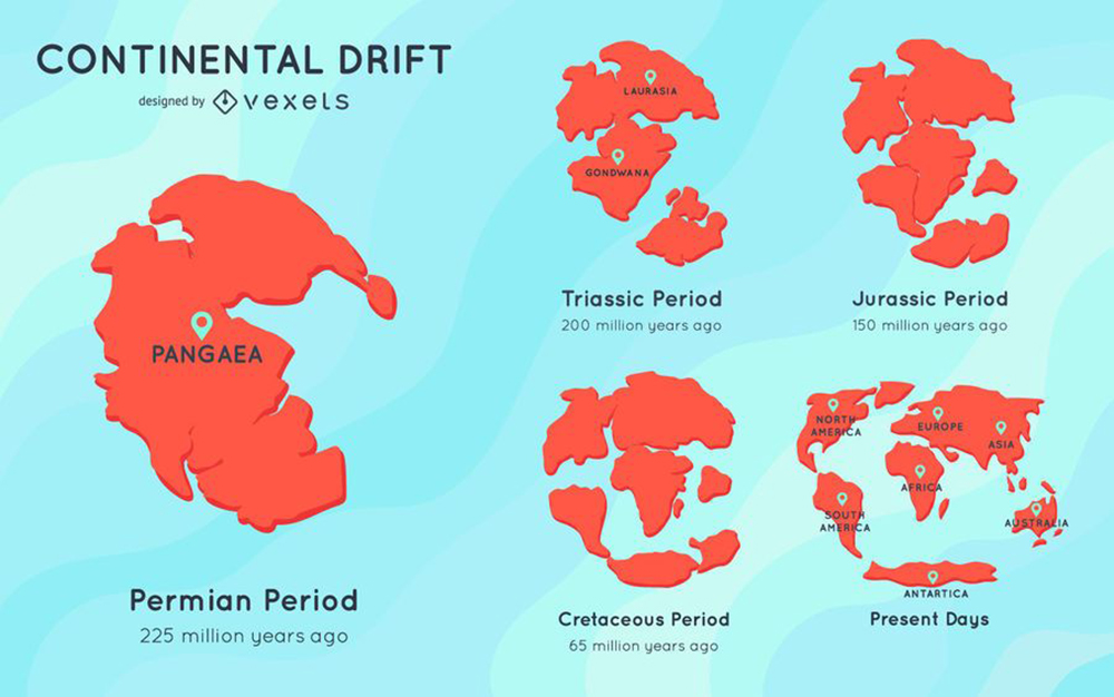 ඇල්ෆ්රඩ් වෙජනර් තම උපකල්පනය 1912 ජනවාරි 06 වැනි දා ජර්මානු භූ විද්යා සංගමයට ඉරිපත් කළේය. ඔහු පවසා ඇත්තේ මහාද්වීප එකිනෙක වෙන් වී වර්තමානයේ පවතින ස්ථාන වෙත යාමට පෙර පැන්ජියා නම් තනි ගොඩබිමක් සෑදී තිබූ බවයි.
