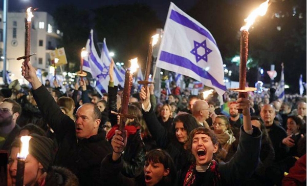 ඊශ්රායලයේ ආන්ඩුව විසින් ඉදිරිපත්කර ඇති අධිකරණ ප්රතිසංස්කරණ සැලසුම් වලට එරෙහිව 80,000කට වැඩි පිරිසක් ටෙල්අවිව් නගරයට රැස්වී විරෝධතා දැක්වූහ.