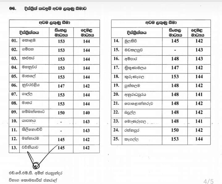 දිස්ත්රික් මට්ටමින් ශිෂ්යත්ව කඩඉම් අවම ලකුණු සංඛ්යාව පහත දක්වා ඇත.
