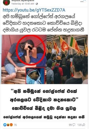 “අපි හම්බුනේ ගෝල්ෆේස් අරගලයේ වේදිකාව හදනකොට” කොච්චියේ බිළිදා දමාගිය යුවල රටටම පේන්න හඳුනාගනී. යනුවෙන් ද තවත් පෝස්ට් රැසක සඳහන් කර ඇත.