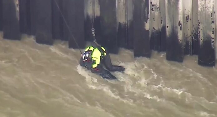සැඩපහරට හසුවී ගසාගෙන යද්දී කොන්ක්රීට් බාධකයක යන්තමින් එල්ලී සිටි පුද්ගලයකු ලොස්ඇන්ජලීස් ගිනි නිවීමේ දෙපාර්තමේන්තුව විසින් බේරාගන්නා ආකාරය දැක්වෙන දර්ශන රොයිටර් පුවත් සේවය මගින් නිකුත් කර ඇත.
