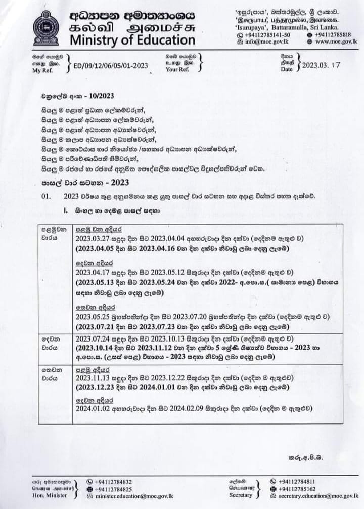 2023 වර්ෂය සඳහා පාසල් අධ්යයන කටයුතු සිදුකරන ආකාරය පිළිබඳ අධ්යාපන අමාත්යාංශය විසින් නව චක්රලේඛයක් නිකුත්කරනු ලැබ ඇත.