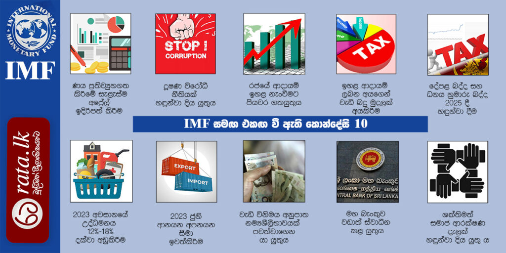 ජාත්යන්තර මූල්ය අරමුදල මගින් ශ්රී ලංකාවට විස්තීරණ මූල්ය පහසුකම් සැපයීමේ දී එකඟතා කිහිපයකට එළැඹී තිබේ. එම එකඟතා යෝජනාවලිය ශ්රී ලංකාව විසින් ඉදිරිපත් කර ඇති අතර වසර 04 ක කාලයක් පුරා වාරික 08ක් ලෙස ලබාදෙන ජාත්යන්තර මූල්ය අරමුලේ සහයෝගය දිගටම ලබාගැනීමට නම් එම කොන්දේසි ඉටුකිරීමට ශ්රී ලංකා රජය බැඳී සිටියි.