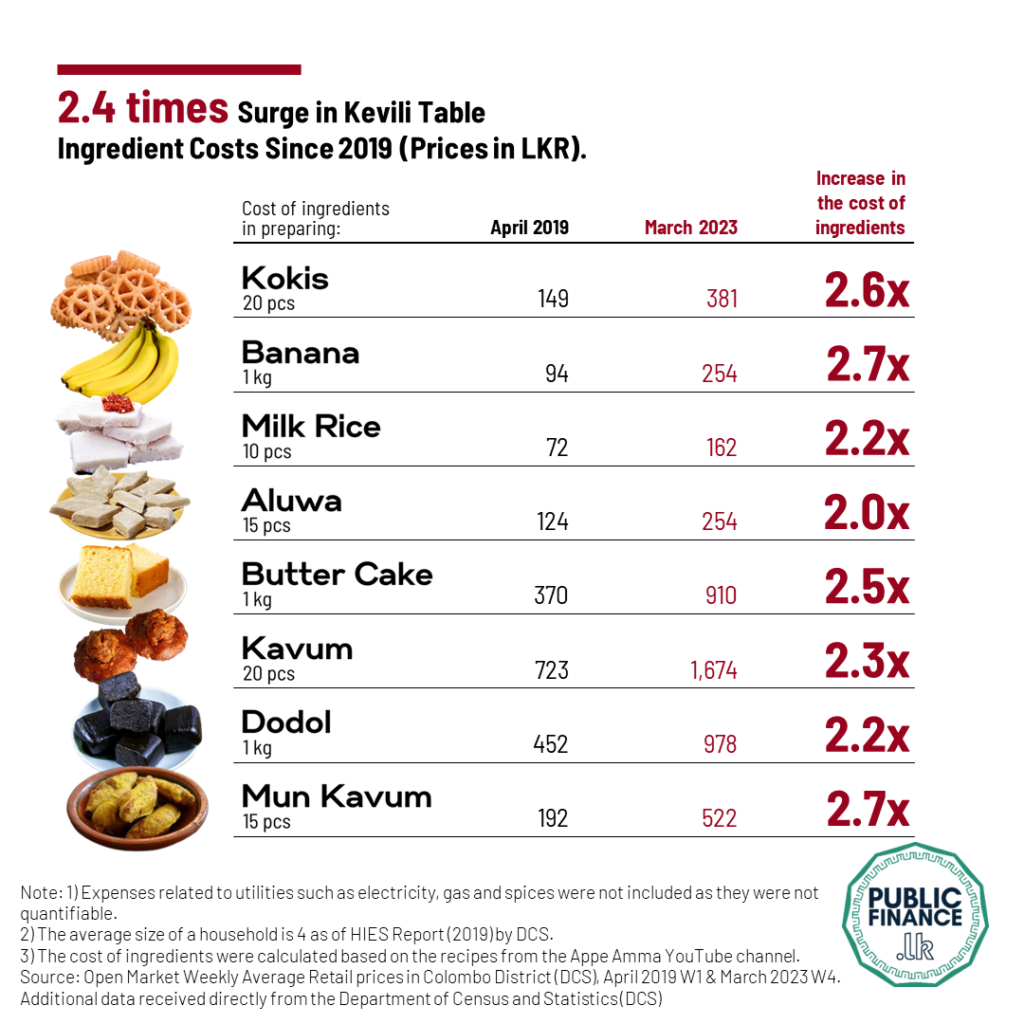 කොරෝනා වසංගතය හේතුවෙන් රට සම්පූර්ණයෙන් හෝ ප්රදේශ වශයෙන් වසා දැමීමට පෙර අවසන්වරට සමස්ත ශ්රී ලංකාවට එක සේ අවුරුදු සැමරූ 2019 වර්ෂයට සාපේක්ෂව 2023 වර්ෂයේ දී අවුරුදු කැවිලි මේසයක් සඳහා වැය කිරීමට සිදුවන මුදල 2.4 ගුණයකින් ඉහළ ගොස් ඇත.