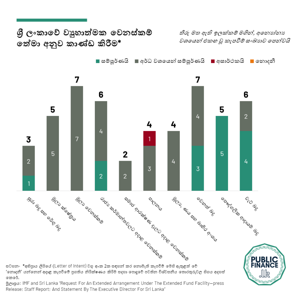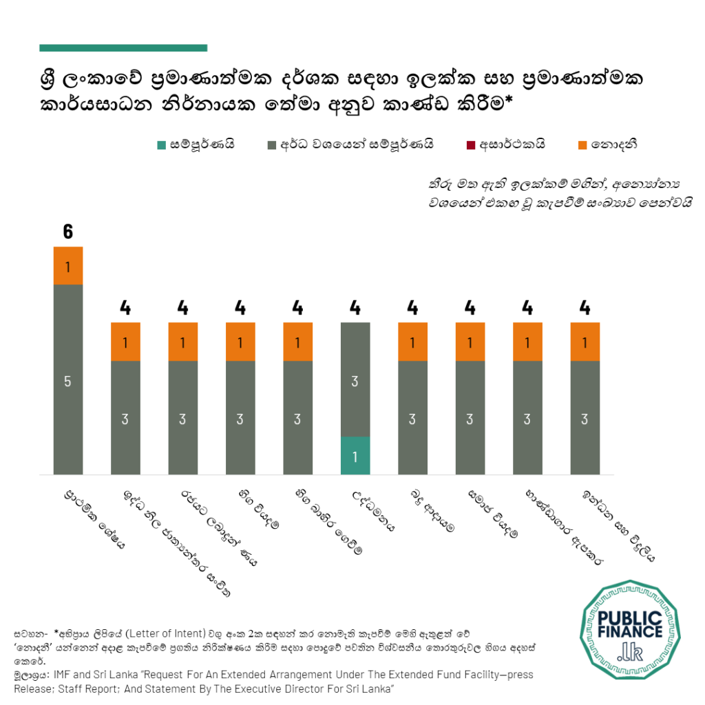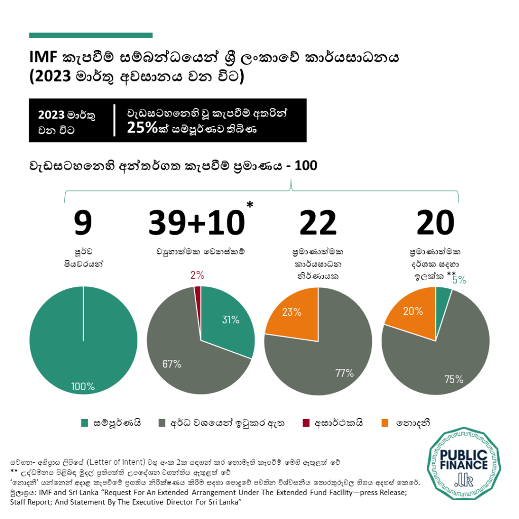 ජාත්යන්තර මූල්ය අරමුදල සමඟ ශ්රී ලංකාව කටයුතු කිරීමේ දී එහි ප්රගතිය මැනිය හැකි කැපවීම්වලින් 25%ක් මාර්තු මාසය වනවිට සම්පූර්ණ කර ඇති බවත්, එක් ප්රධාන කැපවීමක් සම්පූර්ණ කිරීමට අසමත් වී ඇති බවත් වෙරිටේ රිසර්ච් ආයතනය පෙන්වා දෙයි.