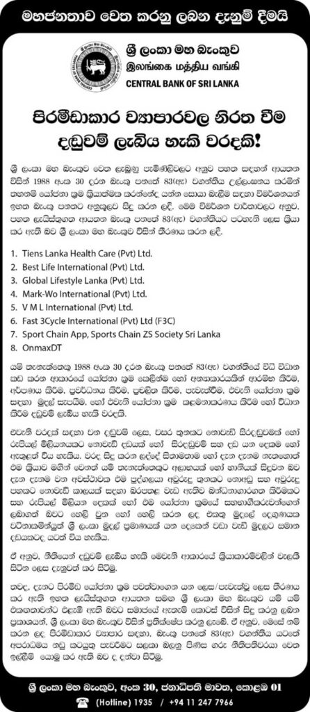 පිරමීඩාකාර ජාවාරම් සිදුකරන සමාගම් 08ක් සම්බන්ධ තොරතුරු ශ්රී ලංකා මහ බැංකුව විසින් ප්රසිද්ධියට පත්කර තිබේ.