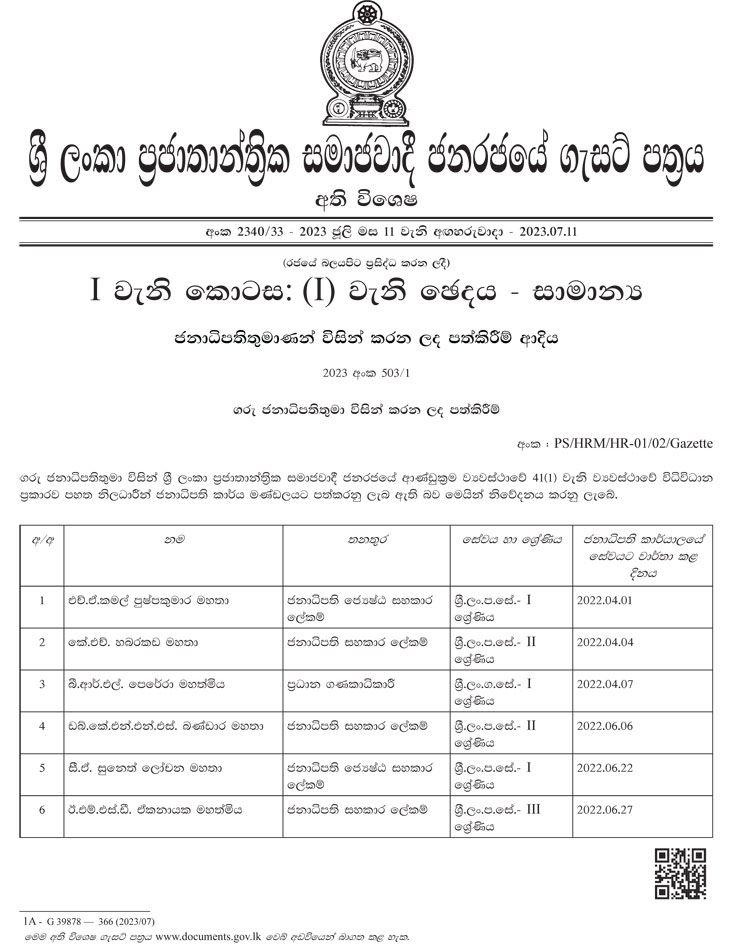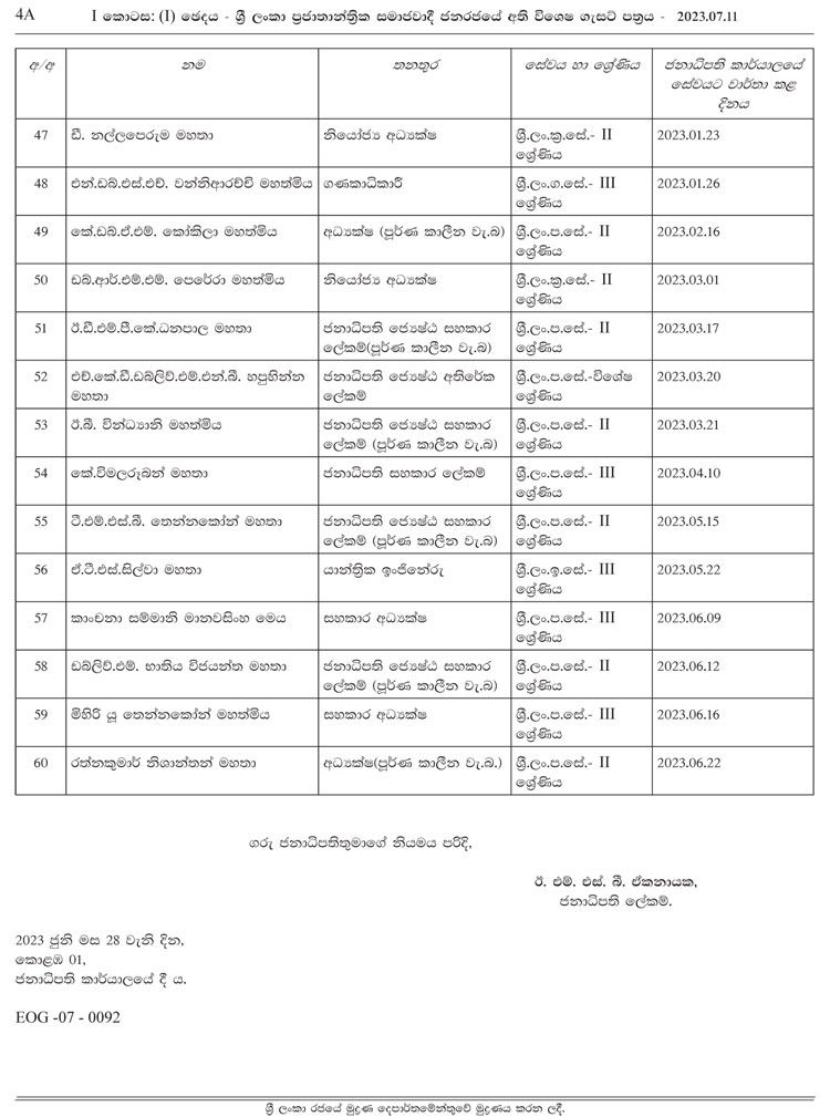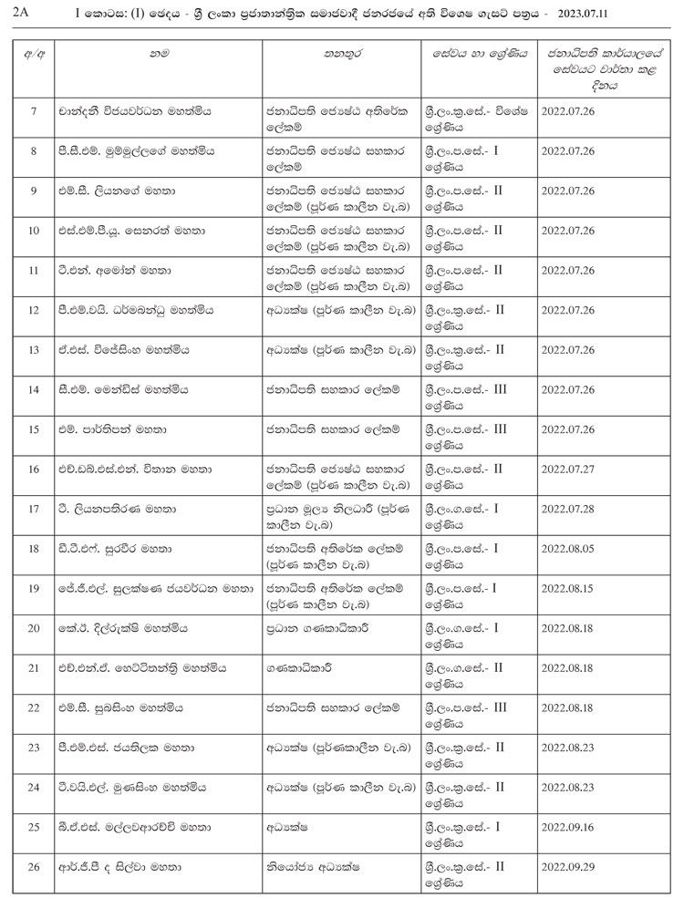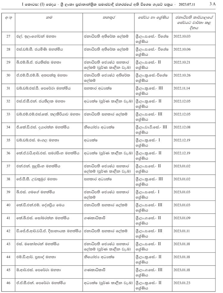 මෙම නිලධාරී නිලධාරිනියන් 2022 අප්රේල් මස 01 වැනි දා සිට වරින්වර ජනාධිපති ලේකම් කාර්යාලයට අනුයුක්ත කරන ලද නිලධාරීන් පිරිසකි.