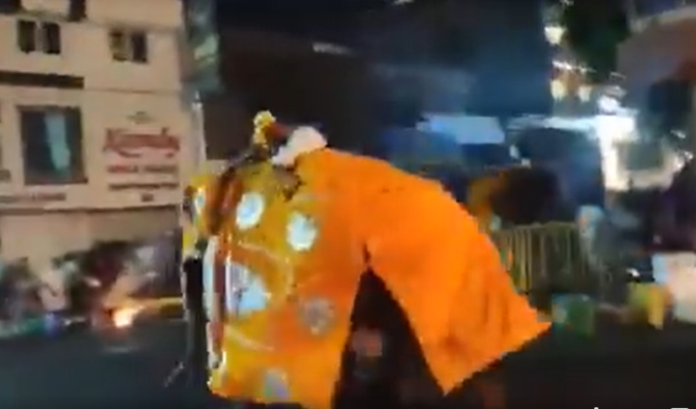 එක් අලියකු රැජින හෝටලයේ කොරිඩෝව වෙත කඩා වැදී කලබල කර ඇති අතර ඇත්ගොව්වන් පිරිසක් එක් වී එම අලියා බැඳ දමා ඇත. අනෙක් අලියා දළදා වීදිය ඔස්සේ දිවගොස් තිබේ.