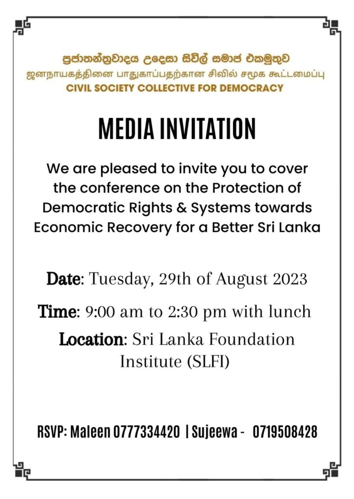 ශ්රී ලංකාවේ ප්රජාතන්ත්රවාදය වඩාත් අර්ථවත් කරගැනීමේ අරමුණින් “ප්රජාතන්ත්රවාදය උදෙසා සිවිල් සමාජ එකමුතුව“ හෙට (29) කොළඹ පදනම් ආයනයේ දී රැස්වෙයි.
