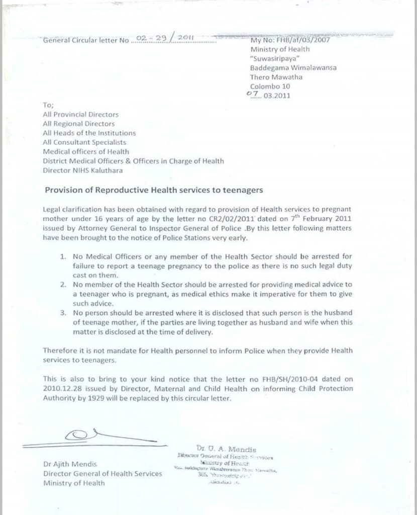 මේ ලිපිය නිකුත් කිරීමේ සිද්ධියට අදාලව ඉතිහාස කතාන්තරයක් තිබේ. අනුරාධපුර දිස්ත්රික්කයේ වෛද්යවරයකු ළමා මවක් සම්බන්ධයෙන් තොරතුරු සැඟවීයැයි පොලිසිය සහ අධිකරණය නීතිය ක්රියාත්මක කළ අවස්ථාවකදී රජයේ වෛද්ය නිලධාරීන්ගේ සංගමයේ ද සහභාගීත්වයෙන් පැවැත්වූ සාකච්ඡාවකින් පසුව නීතිපතිවරයා පොලිසියට උපදෙස් දී ඇත්තේ වෛද්යවරයකු ළමා අපයෝජනයක් සම්බන්ධයෙන් වාර්තා නොකර සිටියායැයි ඔවුන්ට එරෙහිව නීතිය ක්රියාත්මක කිරීමෙන් වළකින ලෙසයි. එම උපදෙස් ලිපියෙන් වෛද්යවරු එවැනි අපයෝජන ගැන දැනුම් දීම අනවශ්ය යැයි කිසිම අයුරකින් කියා නැත.