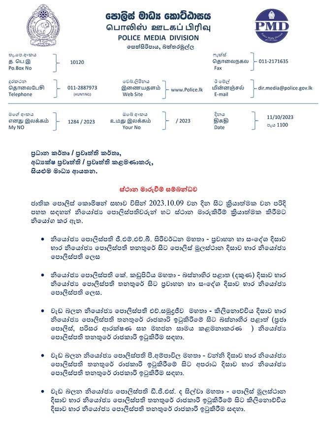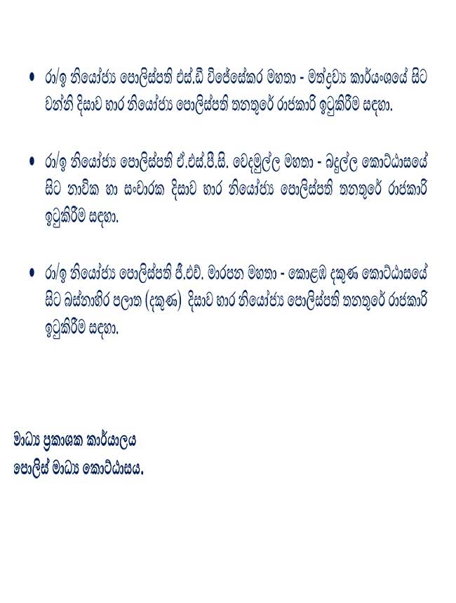 ඔවුන්ට ස්ථානමාරුවීම් ලැබී ඇතතේ 09 වැනි දා සිට ක්රියාත්මක වන පරිදිය.