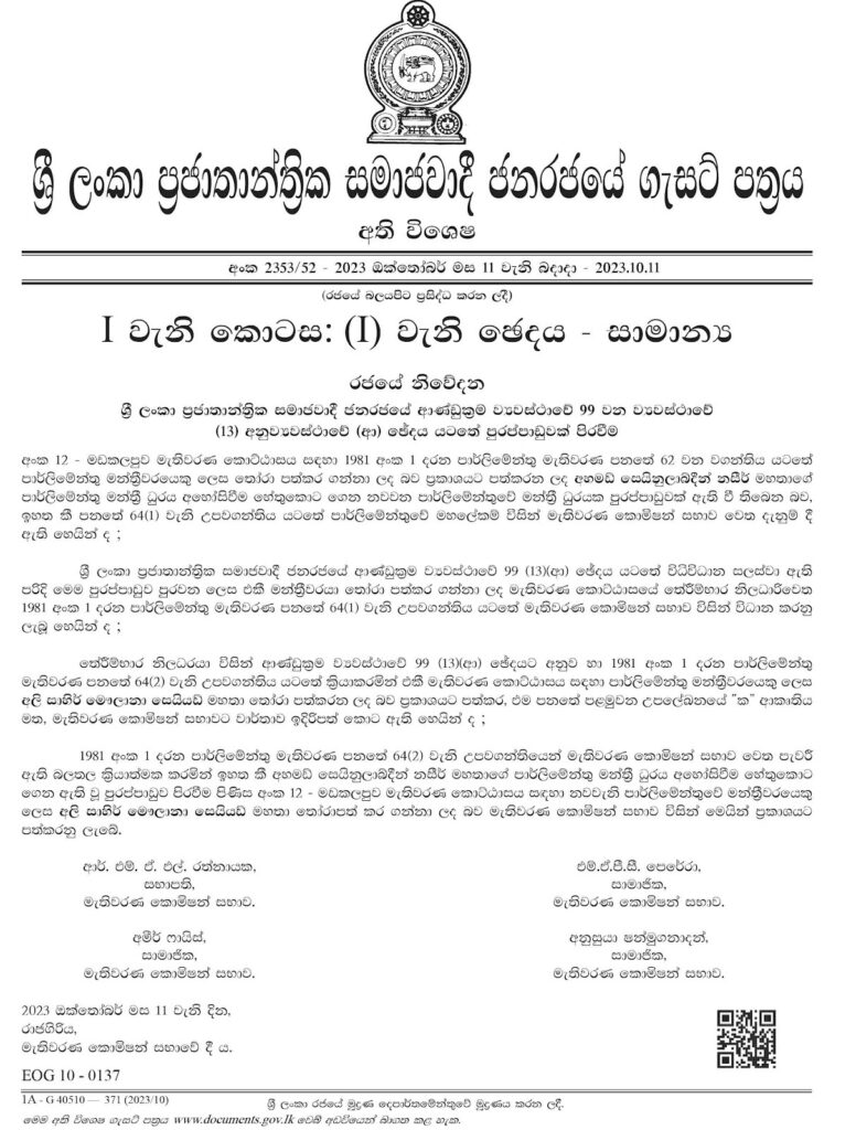 නසීර් අහමඩ් ශ්රී ලංකා මුස්ලිම් කොංගසයෙන් නෙරපා හැරීම හේතුවෙන් හිස් වූ පාර්ලිමේන්තු මන්ත්රීධූරයට අලි සහීර් මවුලානා පත්කිරීම සඳහා අදාල ගැසට් නිවේදනය මැතිවරණ කොමිසම විසින් නිකුත් කර තිබේ.