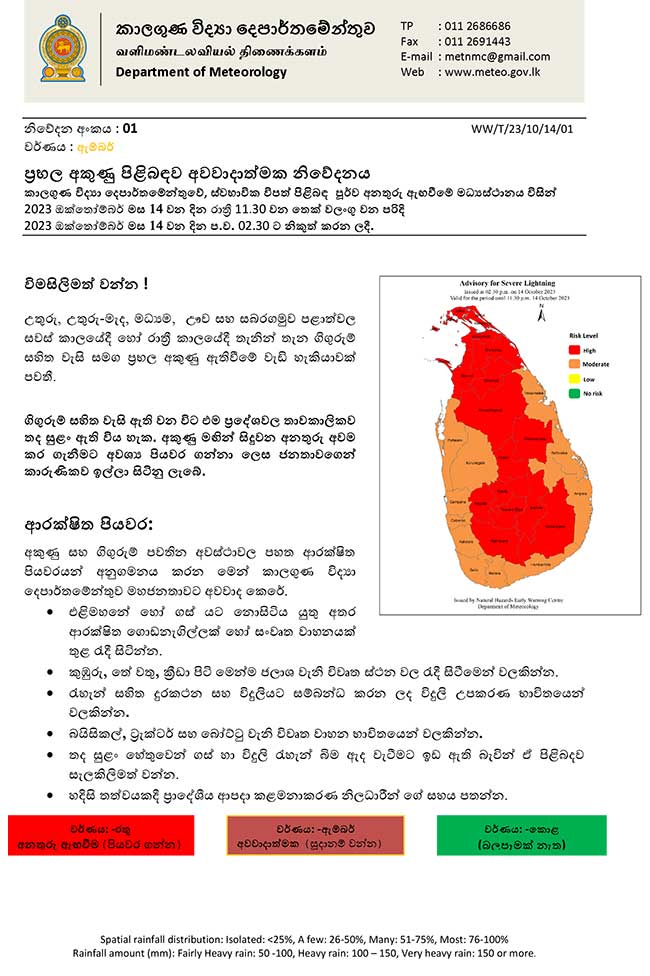 ගිගුරුම් සහිත වැසි ඇති වනවිට එම ප්රදේශවල තද සුළං ඇතිවිය හැකි අතර අකුණු මගින් සිදුවන අනතුර අවම කරගැනීමට කටයුතු කරන ලෙස කාර්යභාර කාලගුණ විද්යාඥ ඉල්ලා සිටියි.