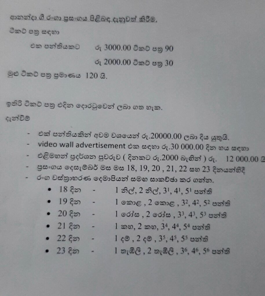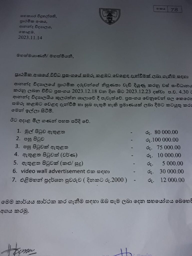 ප්රාථමික අංශයේ සිසු දරුවන්ගේ දක්ෂතා දෙමාපියන් හමුවේ ප්රදර්ශනය කිරීමට බව පවසමින් “ආනන්දා ගී රංගා” නමැති ප්රසංගයකට දරුවන් පුහුණු කර මේ වනවිට එක් පන්තියකින් අවම වශයෙන් රුපියල් 350,000.00ක මුදලක් එකතුකර දිය යුතු බවට දැක්වෙන නිවේදන විද්යාලයේ නියෝජ්ය විදුහල්පතිවරයා විසින් නිකුත්කර තිබේ.