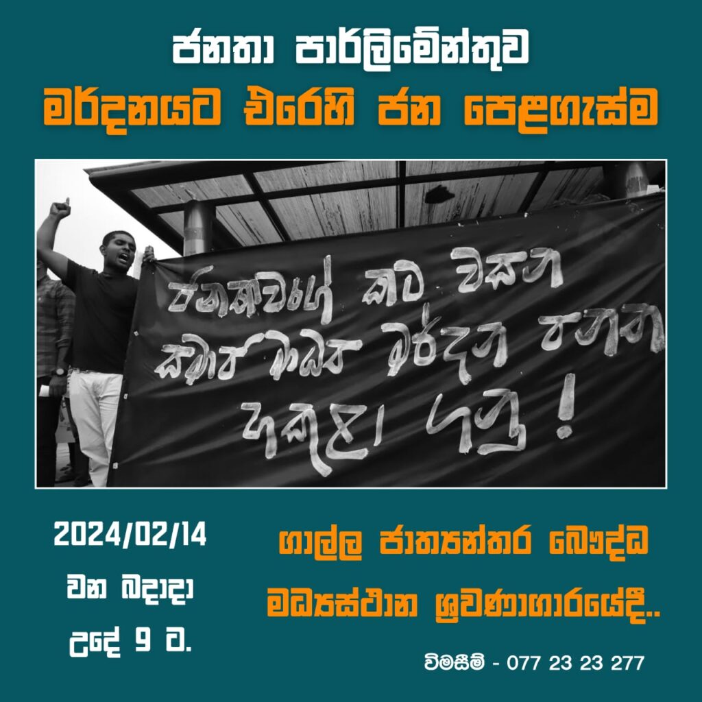 ජනතා පාර්ලිමේන්තුව මර්දනයට එරෙහි ජන පෙලගැස්ම යනුවෙන් නම් කර ඇති මෙම සංවාදය සංවිධානය කරනු ලබන්නේ නීතිය හා සමාජ භාරය සහ සිවිල් සංවිධාන එක්වය.