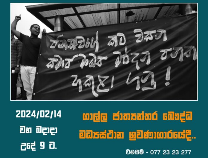 රජය විසින් ඉදිරිපත් කර ඇති මර්දනකාරී අණපනත් සහ රජයේ වගවීමේ ක්රියාවලියේ පවතින දුර්වලතා පිළිබඳව සිදු කෙරෙන මහජන සංවාදයක් ලබන 14 වැනි බදාදා පෙරවරු 9.00ට ගාල්ල ජාත්යන්තර බෞද්ධ මධ්යස්ථාන ශ්රවණාගාරයේ දී පැවැත්වේ.