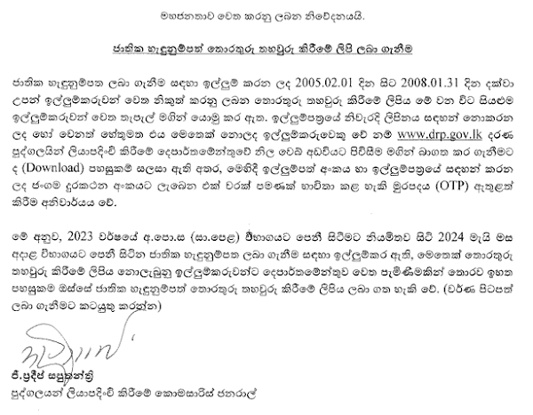 2023 වර්ෂයට නියමිත අධ්යාපන පොදු සහතික පත්ර සාමාන්ය පෙළ විභාගය 2024 මැයි මාසයේ පැවැත්වීමට නියිමතව ඇති බැවින් ජාතික හැඳුනුම්පත් තොරුතරු තහවරු කිරීමේ ලිපිය පහත සඳහන් ක්රමයෙන් ලබාගත හැකි බව පුද්ගලයන් ලියාපදිංචි කිරීමේ දෙපාර්තමේන්තුව දැන්ම දෙයි.
