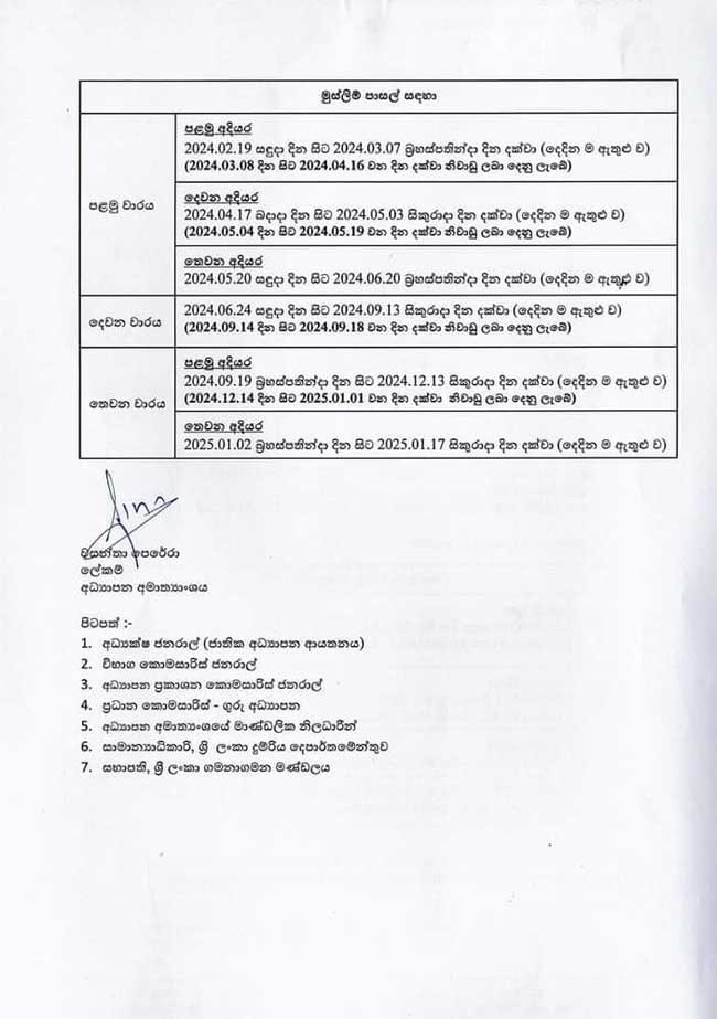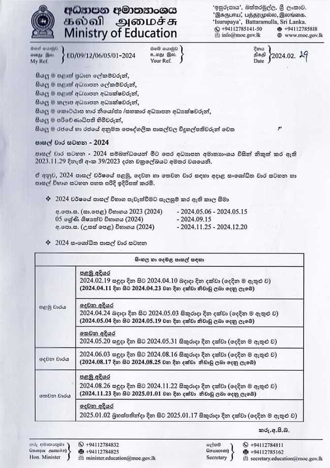 පාසල් අධ්යයන කටයුතු 2024 වර්ෂයේ සඳහා ක්රියාත්මක වන ආකාරය අධ්යාපන අමාත්යාංශය විසින් ප්රකාශයට ප්කර තිබේ.