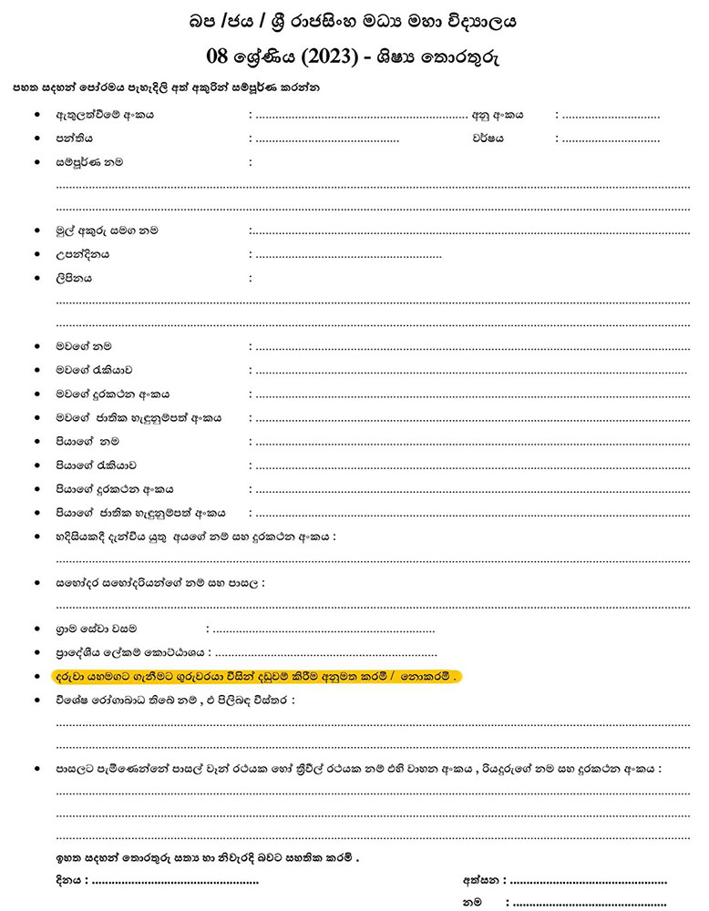 මෙවැනි අවසරයක් ඉල්ලා ඇත්තේ බස්නාහිර පළාතේ, ජයවර්ධනපුර කලාපයේ ශ්රී රාජසිංහ මධ්ය මහා විද්යාලය විසිනි. එම පාසලේ බලධාරීන් විසින් සිසුන්ගේ තොරතුරු එකතුකරන පත්රිකාවක “දරුවා යහමගට ගැනීමට ගරුවරයා විසින් දඬුවම් කිරීම අනුමත කරමි / නොකරමි” යනුවෙන් කරුණක් සඳහන් කර ඇත. එම කරුණු සියල්ල පුරවා දෙමාපියන් එහි අත්සන් තැබිය යුතු වේ.