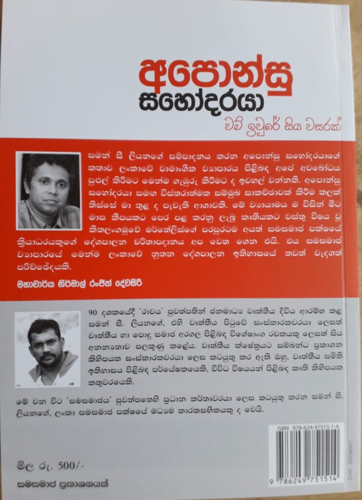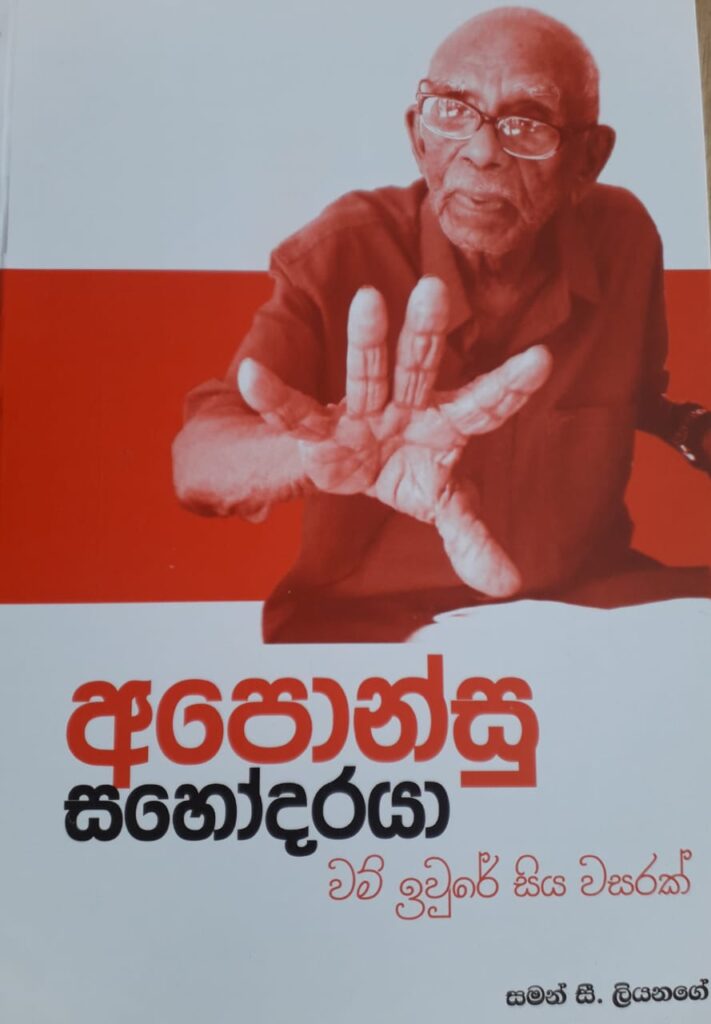 සමන් සී ලියනගේ සහෝදරයා ලියූ අපොන්සු සහෝදරයා: වම් ඉවුරේ සිය වසරක් පොත (මෙය සමසමාජ ප්රකාශණයක්) ග්රාමීය සහ වතු සමාජය තුළින් බිහිව සහ හැදී වැඩී නගරයට සේන්දු වූ තරුණයෙකු සමසමාජ ව්යාපාරය විසින් පරිවර්තනය කෙරුන ආකාරය කදිමට චිත්රණය කෙරෙන පොතක්. 1930ස් ගණන් මැද සිට සමසමාජ සම්ප්රදාය ක්රමික ව්කාශණයකට හසුවන්නේ දහස් ගණන් තරුණ තරුණියන්ගේ ජීවිතද සුපරිවර්තනයකට ලක් කරමිනි. තම පටු අපේක්ෂාවන්ගෙන් ඔබ්බට ගොස් පොදු අරමුණු සහ යහපත වෙනුවෙන් තම ජීවිතයේ පැතිකඩක් වෙන් කෙරුන සමසමාජ කාරයෙකු බිහිවන්නේ කෙසේද යන ප්රශ්නයට වින්සන් අපොන්සු නම් සමසමාජකාරයාගේ ජීවිතයට හැරෙමින් සමන් කදිමට චිත්රණය කරයි.