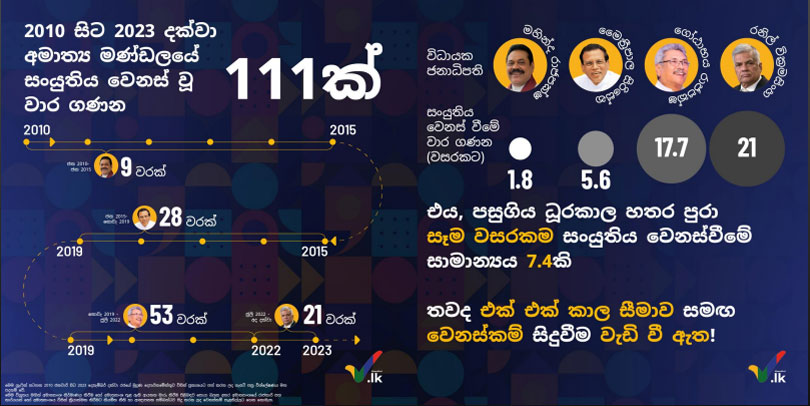 ශ්රී ලංකාවේ අමාත්ය මණ්ඩලයේ සංයුතිය 2010 සිට 2023 වසර දක්වා කාලය තුළ අවස්ථා 111 ක දී වෙනස් වී ඇතැයි වෙරිටේ රිසර්ච් විධායක අධ්යක්ෂ ආචාර්ය නිශාන්ත ද මෙල් ශ්රී ලංකා පුවත්පත් ආයතනයේ ඊයේ (09) පැවැති මාධ්ය හමුවකදී ප්රකාශ කළේය.