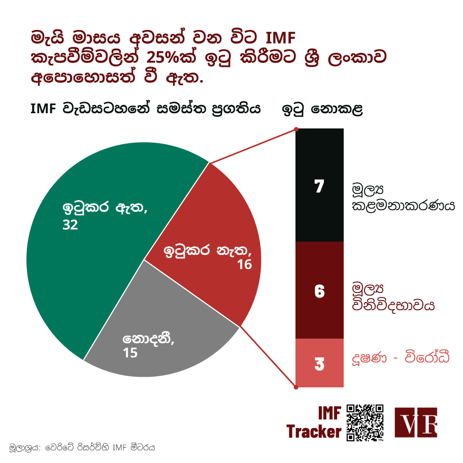 වෙරිටේ රිසර්ච් IMF මීටරයේ අලුත්ම යාවත්කාලීන කිරීමට අනුව 2023 දෙසැම්බර් මාසයේ අලුත් කරන ලද අන්තර්ජාතික මූල්ය අරමුදලේ ණය වැඩසටහන යටතේ 2024 මැයි මස අවසන් වන විට ඉටුකළ යුතුව තිබූ කැපවීම්වලින් 25%ක් ඉටුකිරීමට ශ්රී ලංකාව අපොහොසත්ව ඇත. එසේ ඉටුකළ යුතුව තිබූ කැපවීම් 63න්, 32ක් ‘ඉටුකළ’ ලෙසත්, 16ක් ‘ඉටුකර නැති’ ලෙසත්, 15ක් ‘නොදනී’ ලෙසත්, IMF මීටරය වර්ග කර ඇත. ‘නොදනී’ යන්නේ අර්ථය අදාළ කැපවීමේ ප්රගතිය තහවුරු කිරීමට අවශ්ය දත්ත සහ තොරතුරු නොමැත යන්න වේ.