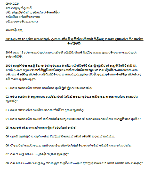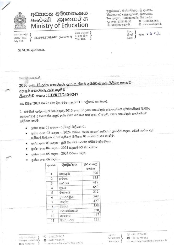 මෙම කරුණු අනාවරණය වී ඇත්තේ SLVlog ආයතනය විසින් 2016 අංක 12 දරණ තොරතුරු දැනගැනීමේ පනත අනුව කරන ලද විමසීමකට අධ්යාපන අමාත්යාංශයේ ලබාදුන් පිළිතුරු අනුවය. එම පිළිතුරු ලබා දී ඇත්තේ අධ්යාපන අමාත්යාංශයේ තොරතුරු නිලධාරී අතිරේක ලේකම් (පාලන) එච්.නිලක්ෂි. එන්. ගුණසේකර විසිනි.