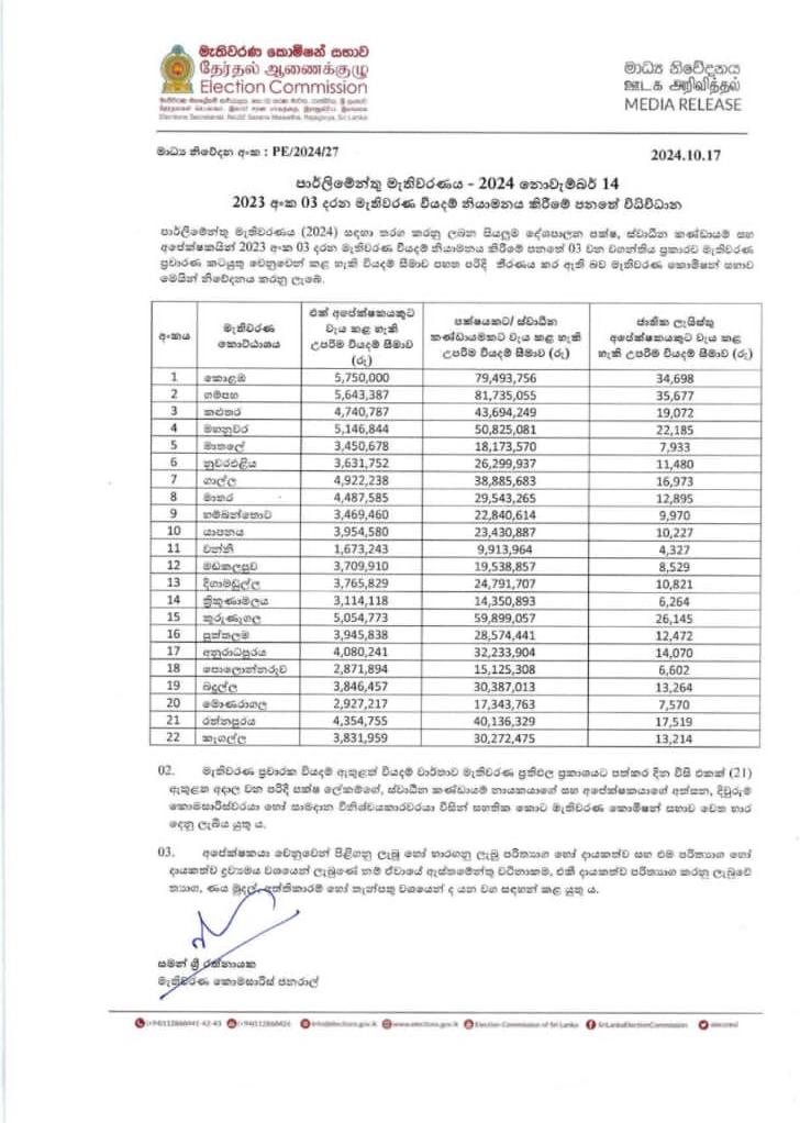 පාර්ලිමේන්තු මැතිවරණයේ දී ඒ ඒ දිස්ත්රික්කවල අපේක්ෂකයන්ට තම ප්රචාරණ කටයුතු සඳහා වියදම් කළ හැකි උපරිම මුදල් සීමාව මැතිවරණ කොමිෂන් සභාව විසින් තීරණය කර ඇත.