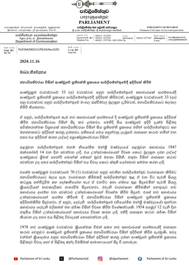 මහ මැතිවරණයෙන් පසු නව රජයේ පළමු පාර්ලිමේන්තුව නොවැම්බර් 21 සවස 3.00ට රැස්වීමට නියමිතය. එලෙස පළමු සභාවාරය ආරම්භයේ දී ජනාධිපති අනුර කුමාර දිසානායක ආණ්ඩුවේ ප්රතිපත්ති ප්රකාශය ඉදිරිපත් කිරීම හෙවත් රාජාසන කතාව සිදුකිරීමට නියමිතය. එම රැස්වීමේ මුලසුන දරන්නේ ජනාධිපතිවරයා විසිනි.
