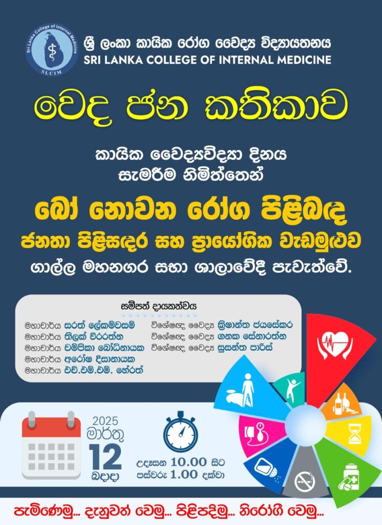 ශ්රී ලංකා කායික රෝග වෛද්ය විද්යායතනයේ 09 වැනි සංවත්සරය වෙනුවෙන් සහ කායික වෛද්ය විද්යා දිනය සැමරීම අරමුණු කරගනිමින්, මෙය සංවිධානය කර ඇති අතර එහි දී බෝනොවන රෝග පිළිබඳ ජනතා පිළිසඳරක් සහ ප්රායෝගික වැඩමුළුවක් පැවැත්වේ.