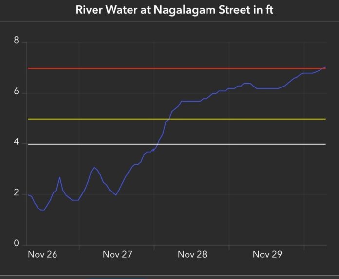 අද (30) අලුයම කැළණි ගඟේ කොළඹ ප්රදේශයේ පිහිටි ජල මාපකය වන නාගලගම් වීදියේ මාපකයේ ජල මට්ටම තියුණු ඉහළ යාමක් වාර්තා වූ අතර, එය උදෑසන 6.06 වන විට අඩි 7.05 ක අගයක් වාර්තා විය. එහි මහ ගංවතුර මට්ටම අඩි 07 කි.