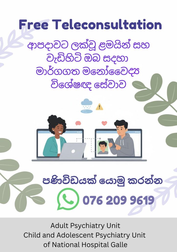 පසුගිය දා පැවැති ආපදා තත්වය හේතුවෙන් විපතට පත් වූ ළමයින් සහ වැඩිසිහිටියන් සඳහා මනෝ වෛද්ය විශේෂඥ සේවාවක් ආරම්භ කිරීමට ගාල්ල ජාතික රෝහල කටයුතු කර තිබේ.