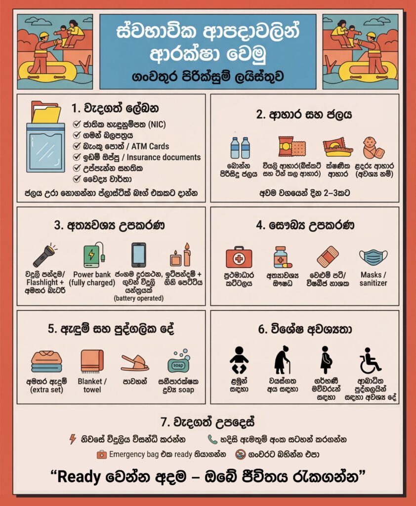 ගංවතුරක් පැමිණෙන විට තීරණාත්මක වන්නේ එම මොහොතේ ඔබ කරන ක්රියාවන් නොව, එයට පෙර ඔබ කර ඇති සූදානමයි. හදිසි ජලගැලීම් අවස්ථාවක කලබලයට පත්වීම වෙනුවට, කලින් සැලසුම් කර සූදානම් වීම ඔබගේ කාලය ඉතිරි කරමින් ජීවිතාරක්ෂාව තහවුරු කරයි. වැදගත් ලියකියවිලි, අත්යවශ්ය ඖෂධ සහ ආහාර ද්රව්ය සුරක්ෂිතව සකස් කර තබාගැනීමෙන්, ඔබට අවදානම අවම කරගෙන සන්සුන්ව සහ විශ්වාසයෙන් ක්රියා කිරීමට හැකි වේ.ඔබ සහ ඔබගේ පවුල ආරක්ෂිතව තබාගැනීමට අවශ්ය සරල නමුත් වැදගත් පියවරයන් ඔබට මතක් කිරීම මෙහි අරමුණයි. අදම සූදානම් වීම හෙට දිනයේ ඔබගේ ජීවිතය රැකගැනීමට උදව්වක් විය හැක.