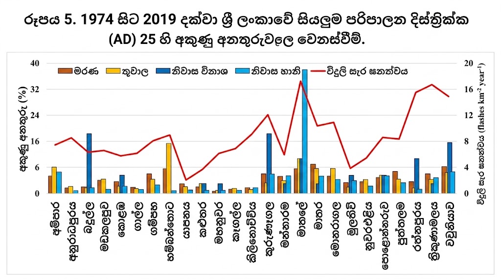 රත්නපුර සහ කළුතර දිස්ත්රික්ක අකුණු අනතුරු හේතුවෙන් වැඩිම මරණ සංඛ්යාවක් වාර්තා වූ ප්රදේශ ලෙස හඳුනාගෙන ඇත. එමෙන්ම පොළොන්නරුව දිස්ත්රික්කය වැඩිම තුවාල ලැබූවන් වාර්තා වූ ප්රදේශය වන අතර, කෑගල්ල දිස්ත්රික්කය දේපළ හානි වැඩිම ලෙස සිදුවූ ප්රදේශය ලෙස සඳහන් වේ. මෙය ප්රදේශ අනුව අවදානම් මට්ටම් වෙනස් වන බව පැහැදිලි කරයි.