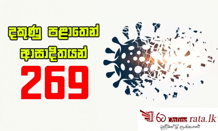 දකුණු පළාතෙන් කොරොනා රෝගීන් 269ක් වාර්තා වන බව සෞඛ්ය අංශ පවසයි. ඉන් 151 දෙනෙක් සුවය ලබා සිටිති.