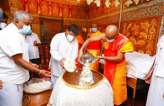 පල්ලෙකැලේ වී අටුවෙන් රැගෙන ආ අලුත් සහලින් පිසූ කිරිබත් දළදා සමිඳුන් අභියස දී පූජා කරමින් මේ වසරේ අලුත් සහල් මංගල්යය මෙලෙස පැවැත්විණි. රටට සෞඛභාග්යය ද සශ්රීකත්වයක ද ප්රාර්ථනා කරමි්න සෑම වසරක ම පවත්වන ශ්රී දළදා මාලිගාවේ අලුත් සහල් මංගල්යය වාර්සික සතර මහා මංගල්යයන්ගෙන් පළමු මංගල්යය ලෙස සැළකේ.