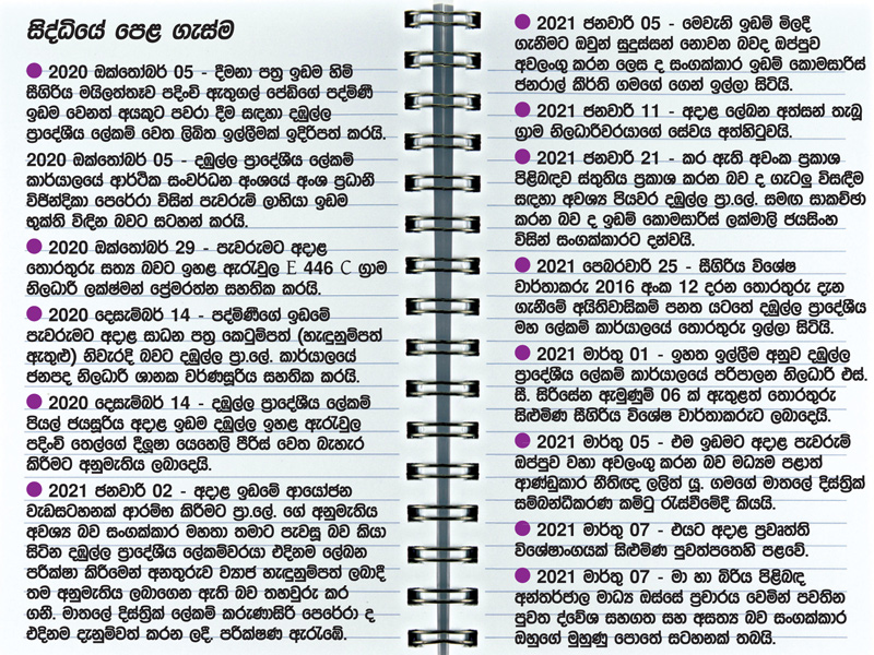 ඒ අතර දඹුල්ල ප්රාදේශීය ලේකම් කාර්යාලයේ ග්රාම නිලධාරීවරයකු ඉඩම් පැවරීමක් හේතුවෙන් වැඩ තහනමට ලක්විය. ඊට හේතුව සොයා ගැනීමට නොහැකි වීම හේතුවෙන් අප සිදු කළේ තොරතුරු දැනගැනීමේ පනත හරහා දඹුල්ල ප්රාදේශීය ලේකම් කාර්යාලයෙන් එම ලිපි ලේඛන සැකසූ ආකාරය පිළිබඳව තොරතුරු ලබාගැනීමය. එම ලිපි ලේඛන අප සතු වීමත් සමඟ මෙය ඉතා සූක්ෂම ලෙස ව්යාජ ලිපි ලේඛන පුද්ගලයන් සඳහා යොදා සාදා ගෙන ඉඩම් පැවරීම සිදුවෙන බව හෙළිදරව් විය.