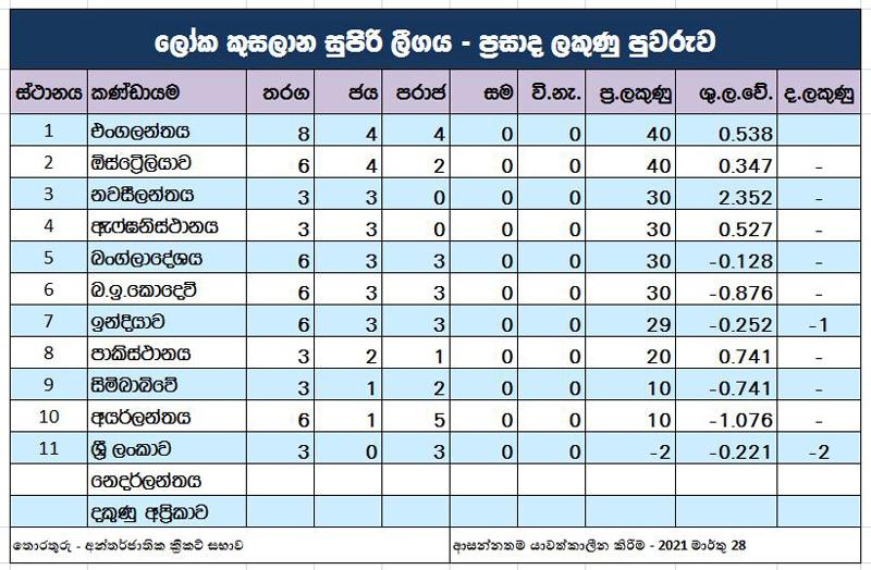 මීළඟ ක්රිකට් ලෝක කුසලානය සඳහා සුදුසුකම් ලබන කණ්ඩායම් ලේඛනයේ ශ්රී ලංකා කණ්ඩායම පහතටම වැටී ඇතැයි ICC නිකුත් කළ ලකුණු සටහන අනුව දැක්වේ.