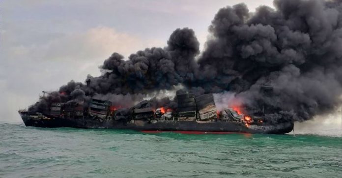 නැවේ මැද කොටසේ හටගත් ගින්න මේ වනවිට නැව පුරාම ව්යාප්තවීම හේතුවෙවන් එය දකුණු පැත්තට ඇළවී තිබේ. නැවේ පිපිරීම් කිහිපයක් ම ඊයේ (25) අළුයම සිට සිදුව තිබිණි. මේ පිපිරීම් සමඟ නැවේ තිබූ කන්ටේනර් කිහිපයක් මුහුදට වැටුණු අතර නැව මේ වනවිට ඇළවී තිබෙන බැවින් ගිනි ගන්නා කන්ටේනර් ද වරින් වර මුහුදට වැටී ගිලී යන බව නාවික හමුදාව සහ සමුද්ර පරිසර දූෂණ අධිකාරිය විසින් නිරීක්ෂණය කර තිබේ.