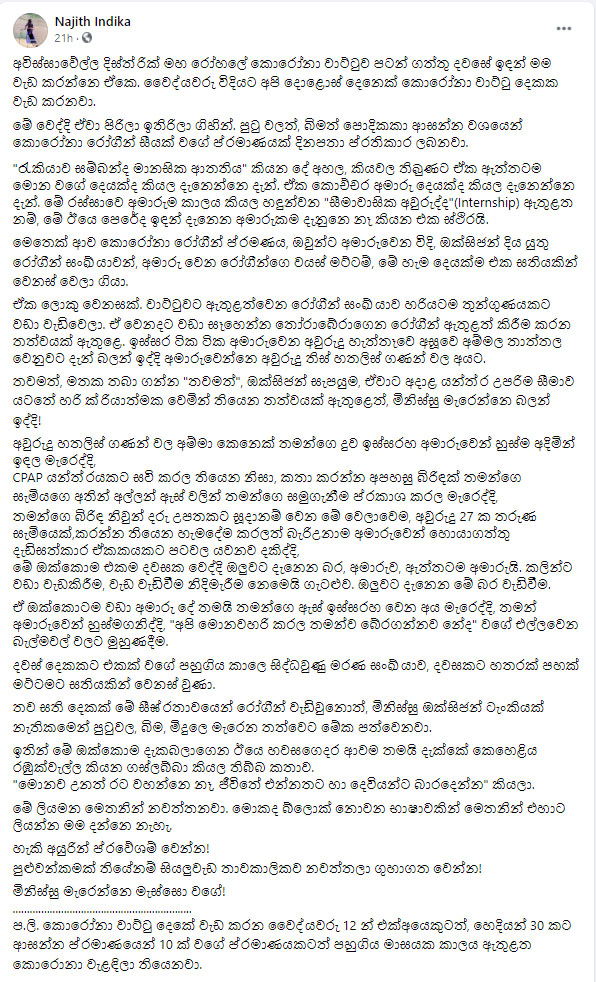 අවුරුදු හතළිස් ගණන්වල ඉන්න අම්මා කෙනෙක් තම කුඩා දියණිය ඉස්සරහ අමාරුවෙන් හුස්ම අදිමින් ඉඳලා මැරෙද්දී, ශ්වසන ආධාරක යන්ත්රයකට සවිකරලා නිසා කතා කරගන්න බැරිව ඉන්න බිරිඳක් තමන්ගේ මහත්තයාගේ අතින් අල්ලගෙන ඇස්වලින් තමන්ගේ සමුගැනීම ප්රකාශ කරල මැරෙද්දී. නිවුන් දරු උපතකට සූදානම් වෙන තමන්ගේ ආදරණීය බිරිඳට කරන්න තියෙන හැමදේම කරලා බැරිම තැන අමාරුවෙන් සොයාගත්තු දැඩි සත්කාර ඒකකයට යවද්දී 27 හැවිරිදි තරුණ සැමියා බලාගෙන ඉන්නවා දකිද්දී “රැකියාව පිළිබඳ මානසික ආතතිය” කියන දැන් තමයි අත්විඳින්නේ යැයි ඉතාමත් අනුවේදනීය සටහනක් අවිස්සාවෙල්ල දිස්ත්රික් මහ රෝහලේ කොරෝනා ඒකකයේ වෛද්යවරයකු වන නජිත් ඉන්දික facebook හි අනුවේදනීය සටහනක් තබා තිබිණි.