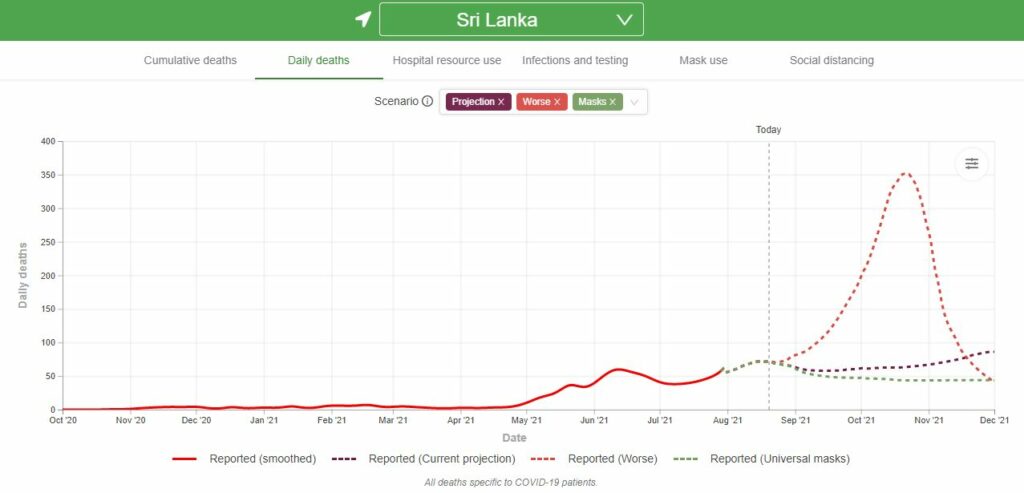 දැනට IHME ආයනය කර ඇති පුරෝකථනයට පදනම්ව ඇත්තේ මීට සති 02කට පමණ පෙර මෙරට සෞඛ්ය අමාත්යාංශයෙන් නිකුත්කරන ලද නිල දත්ත පමණි. අද (20) වනවිට මෙරට නිල දත්ත විශ්ලේෂණය කර ඉදිරිපත් කරනු ලබන පුරෝකථනය අපට තව දින කිහිපයකින් දැකගත හැකිවනු ඇත.