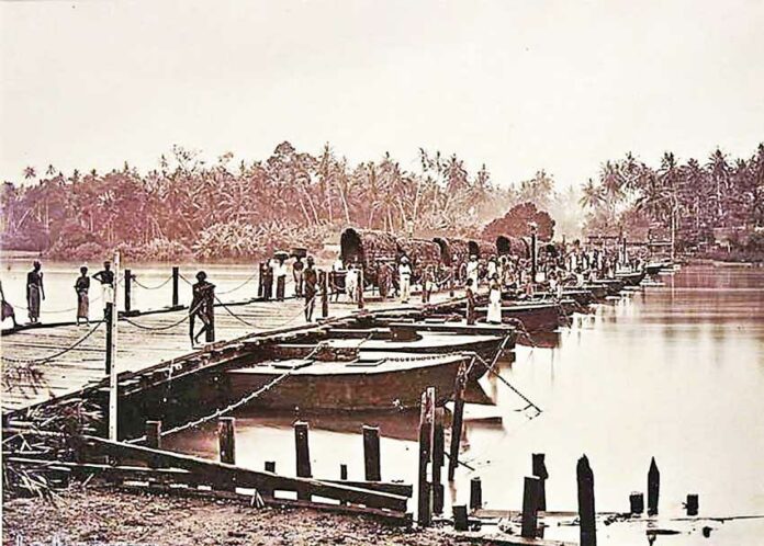 එකල එම පාලම සඳහා ඔරු 21ක් යොදාගෙන තිබූ අතර පාලමේ දිග අඩි 500 ක් බව ද සඳහන් වේ.