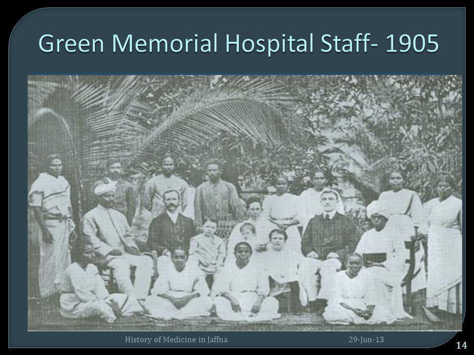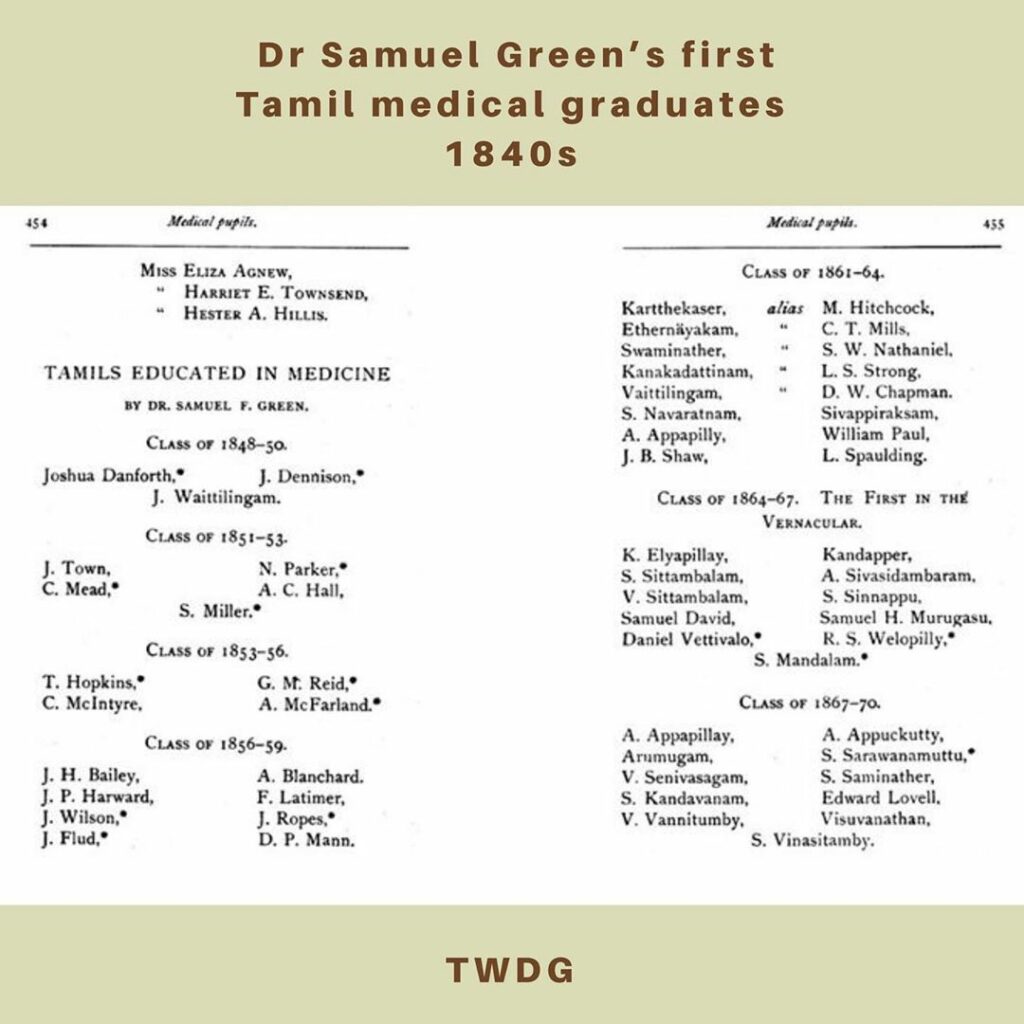 පැරණි ලේඛණ අනුව වෛද්ය ග්රීන්ගේ යාපනය මනිපායි වෛද්ය විද්යාලයෙන් 1848 සිට 1878 දක්වා කාලයේ දී වෛද්යවරු 87 දෙනකු පුහුණුව ලබා පිටවූහ.