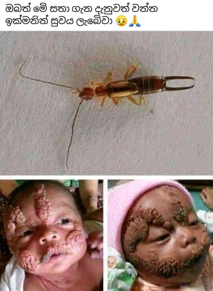 අප විසින් උපුටා දක්වන ඡායාරූප සහිත facebook පෝස්ටුවේ පවසන ආකාරයට මේ දරුවාගේ ජනාගත රෝගයත් අතර earwig සතකුගේ හෝ වෙනත් කිසිම සතකුගේ සම්බන්ධයක් නැත.