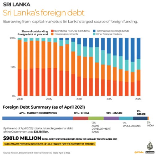 2022 ජනවාරි මාසයේ දී ශ්රී ලංකාව චීනයෙන් ඉල්ලා සිටියේ සිය ණය ප්රතිව්යුහගත කරන ලෙසයි. නමුත් චීනය එය ප්රතික්ෂේප කරමින් ණය ගෙවීම සඳහා තවත් ණය මුදලක් ලබාදීමට එකඟතාව ප්රකාශ කළේය. ණය ගෙවීම සඳහා චීනයට ම ණය වීමට ශ්රී ලංකාවට සිදුවිය. පෙබරවාරි මාසයේ දී තෙල් මිල දී ගැනීම සඳහා ඉන්දියාවෙන් ඩොලර් මිලියන 500ක් ණයට ගැනීමට සිදුවිය. මාර්තු 18 වැනි දා ඉන්දියාව ශ්රී ලංකාවට අත්යාවශ්ය ආහාර සහ ඖෂධ සඳහා ගෙවීමට ඇමෙරිකානු ඩොලර් බිලියන 01ක ණය මුදලක් ලබා දුන්නේය.