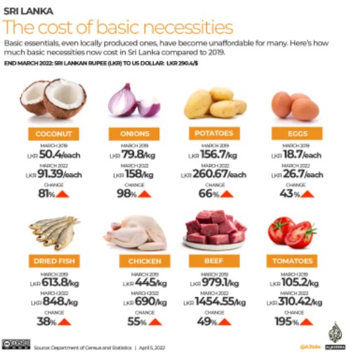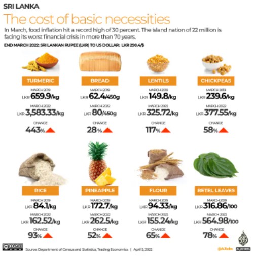 නමුත් මේ වනවිට ශ්රී ලංකාව වසර 70කට වැඩි කාලයක් තුළ මුහුණ දුන් දරුණුත ම මූල්ය අර්බුදයට ලක්ව සිටී. දිවයිනේ ආහාර ඇතුළු අත්යාවශ්ය ද්රව්යවල මිල මාර්තු මාසයේ දී පඹණක් අවම වශයෙන් 30%කින් ඉහළ ගියේය.