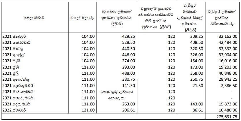 ඒ අනුව ඉහත කාලයට අදාලව නියෝජ්ය සාමාන්යාධිකාරී තනතුරේ සිටි දෙදෙනකු විසින් පමණක් ඉන්ධනවලට යැයි කියමින් රුපියල් 1,037,301.33 ක මුදලක් වැඩිපුර ලබාගෙන තිබේ.