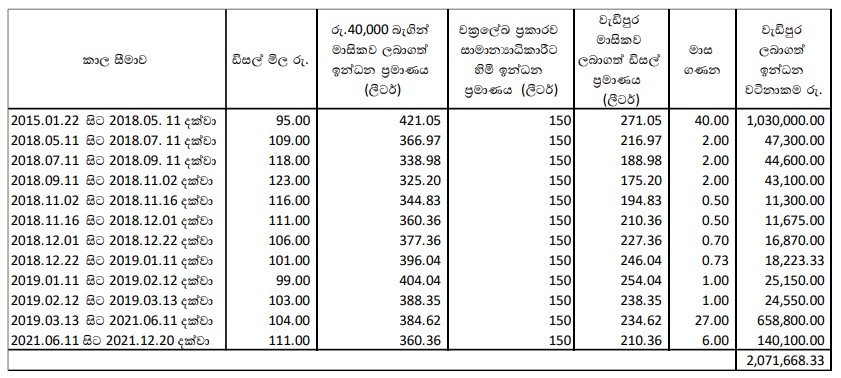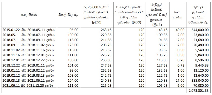 2015 වර්ෂයේ සිට 2021 දෙසැම්බර් 20 දක්වා නියෝජ්ය සාමාන්යාධිකාරී තනතුරේ සිටි නිලධාරී නිලධාරිනියන්ට හිමි ඉන්ධන ප්රමාණයන් සහ ඔවුන් විසින් වැඩිපුර භාවිතා කර ඇති ඉන්ධන ප්රමාණයන් යැයි කියමින් ලබාගෙන ඇති මුදල් ප්රමාණය පහත වගුවේ දක්වා ඇත.