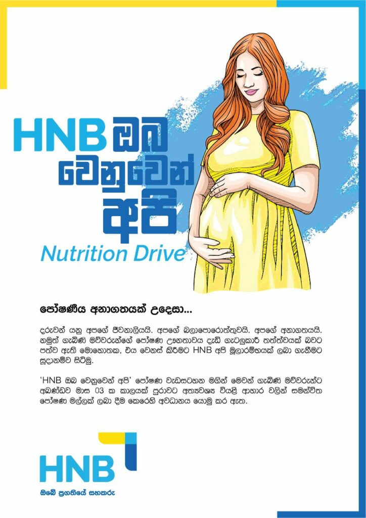 හැටන් නැෂනල් බැංකුව “HNB ඔබ වෙනුවෙන් අපි” ව්යාපෘතිය මගින් උතුම් මාතෘත්වයට පිය නගන මව්වරුන් සඳහා වියළි ආහාර ඇතුළු පෝෂණ මල්ලක් පිරිනැමීමට අමතරව අලුත උපන් බිලිඳාට රුපියල් 1,000.00ක තැන්පතුවක් සමඟ “HNB සිඟිති කිරි කැටියෝ” ගිණුමක් ද පරිත්යාග කරනු ලබයි. එය මේ අවස්ථාවේ දී ම ලබා දුන් අතර දරුවන් ඉපදීමෙන් පසු දරුවාගේ උප්පැන්න සහතිකය ඉදිරිපත් කර ළඟ ම පිහිටි HNB පාරිභෝගික සේවා මධ්යස්ථානයෙන් දරුවාගේ “HNB සිඟිති කිරි කැටියෝ” ගිණුම ආරම්භ කිරීමට අවස්ථාව ලැබෙයි.